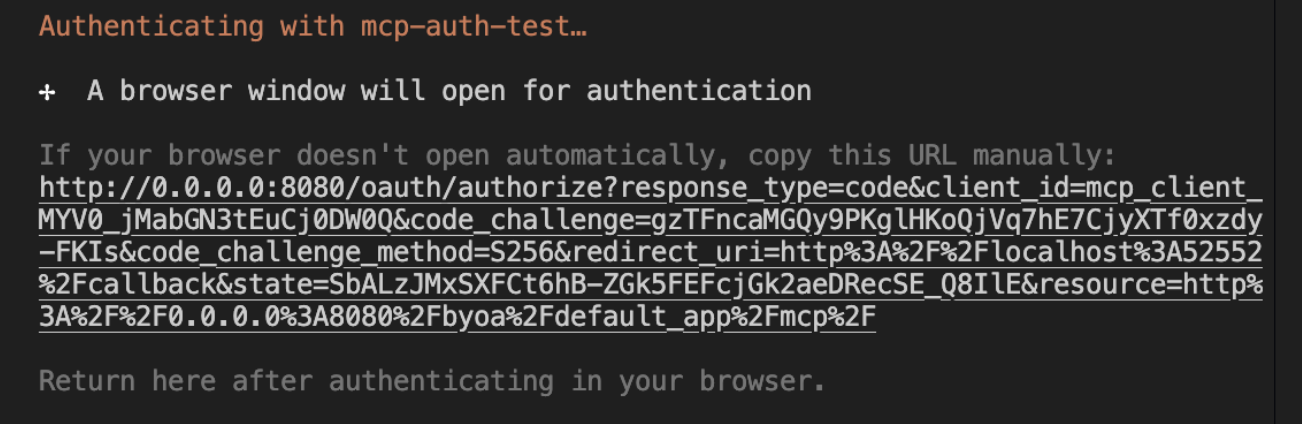 With the MCP authorization code generated, the server redirects the user back to the client application. This redirect includes the authorization code and the original state parameter: