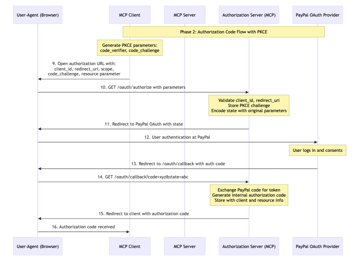 Upon successful validation, the MCP server generates its own authorization code. This isn’t simply forwarding PayPal’s code it’s creating a new, MCP-specific code that’s bound to the original client, includes the resource indicator, and incorporates the PKCE challenge. This separation ensures that MCP authorization codes have their own lifecycle and security properties, independent of the underlying identity provider.