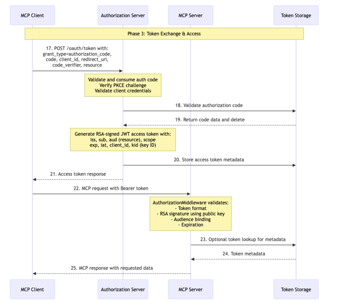 Following successful authorization, the client must exchange its authorization code for an access token that can be used to access protected MCP resources. This phase implements crucial security mechanisms that ensure only legitimate clients can obtain and use access tokens.